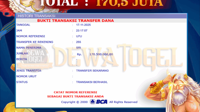 DEWATOGEL mengucapkan selamat kepada user id : RTY*** yang telah berhasil mendapatkan jackpot pada permainan SLOT DI GATES OF OLYMPUS 1000. Kemenangan sebesar Rp 170.500.000,-. telah dibayarkan LUNAS oleh pihak dewatogel kepada pemilik user id setelah yang bersangkutan mengisi formulir withdraw. Proses pencairan dana berlangsung sangat cepat hanya dalam waktu 5-10 menit sudah berada dalam rekening pemilik user id. Bukti transfer yang dapat anda lihat adalah bukti SAH / VALID yang langsung di dapatkan melalui bukti transaksi dari Bank yang digunakan untuk pengiriman dana pada rekening pemilik user id. Terima kasih kami sampaikan kepada para pengguna setia DEWATOGEL yang telah menggunakan situs kami, sebagai Bandar Terpercaya yang pastinya membayar semua kemenangan member hingga lunas. Apakah DEWATOGEL PENIPU ? Reputasi “DEWATOGEL TERPERCAYA” sudah sangat melekat. puluhan hingga ratusan ribu pengguna setia DEWATOGEL tetap menggunakan situs terbesar dan terbaik di Indonesia ini. Hapus rasa was-was dan khawatir anda, kemenangan anda berapapun PASTI dibayarkan hingga lunas.